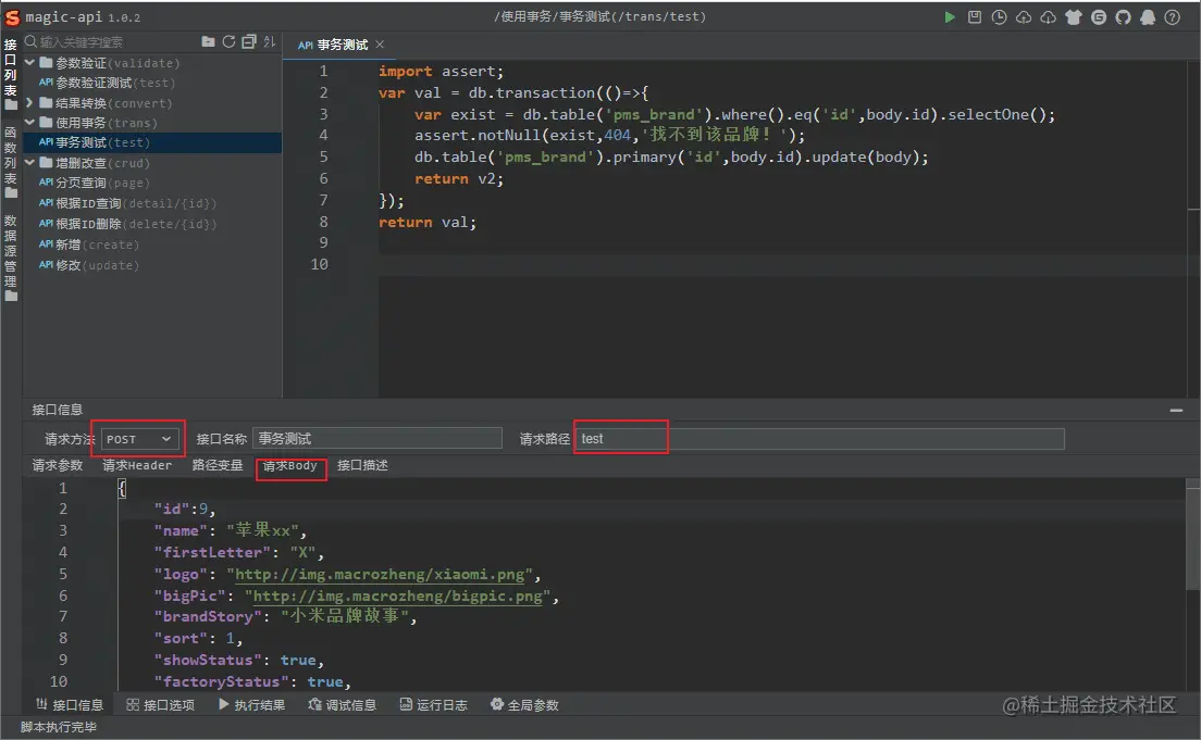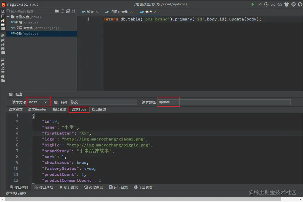 - 再来个修改的接口,在编辑框中输入如下脚本;