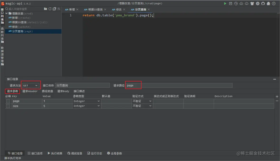 - 再来个分页查询查询的接口,在编辑框中输入如下脚本;