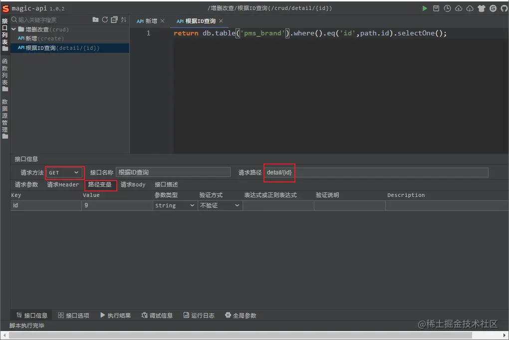- 再来个根据ID查询的接口,在编辑框中输入如下脚本;