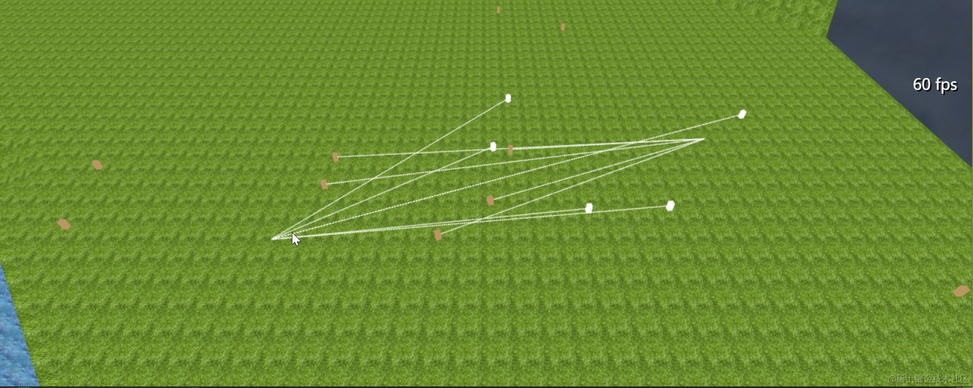 白色虚线为单位的预计路径,可以看到单位贴合地面运动,经由坡道跨越河流,而非直线飞跃。(在长距离导航时发现部分单位的预计路径没有显示,因时间有限尚未仔细调试)