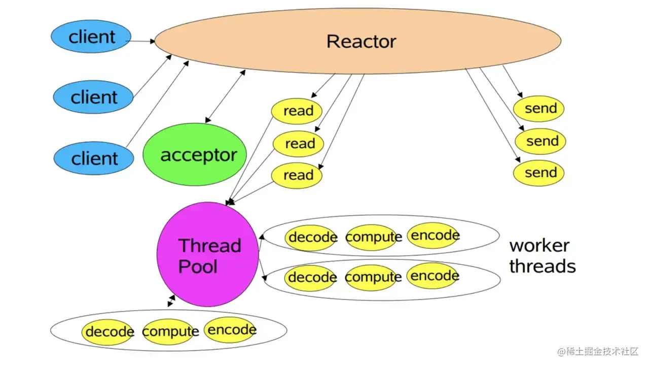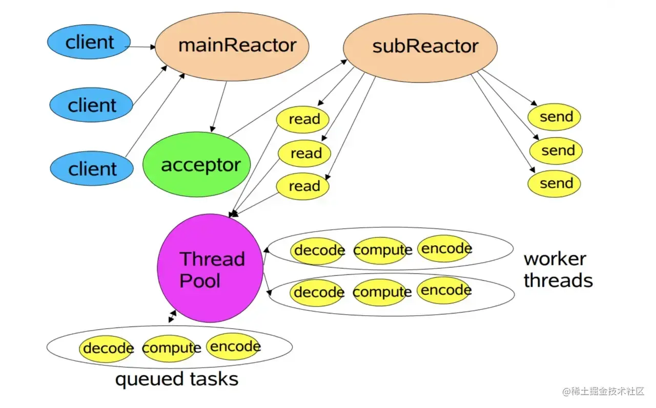 AcceptThread线程调用selector.select()获取连接事件,并从SelectorThread线程组中选择一个SelectorThread线程,将该连接事件放入到SelectorThread对应的acceptedQueueSelectorThread线程组包含多个**SelectorThread线程88,在线程执行时,会从acceptedQueue连接事件,然后将该连接注册到其成员变量selector上,这样就完成连接与**SelectorThread**线程的绑定SelectorThread线程执行select操作,获取selector上发生的读写事件