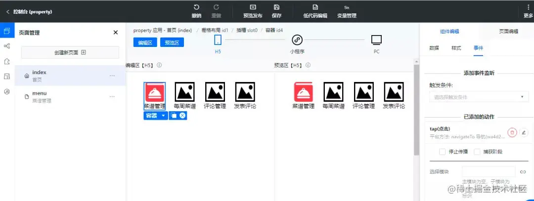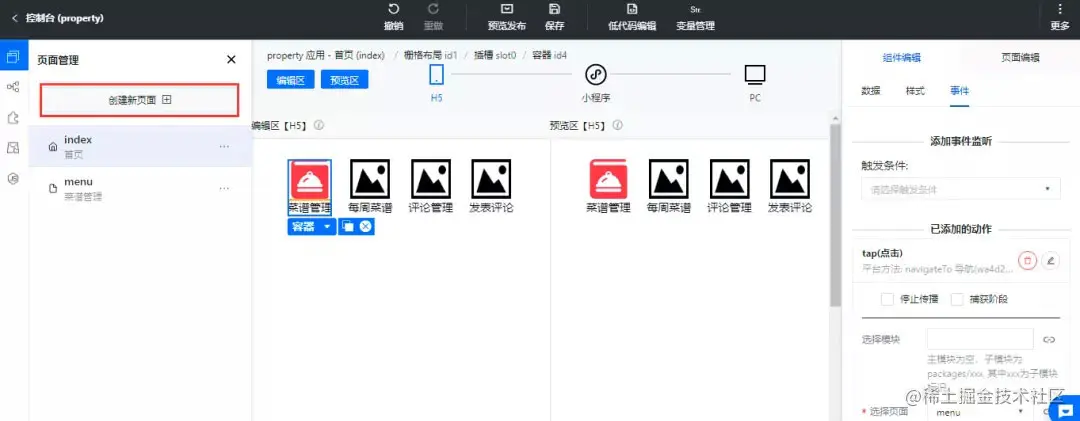 页面创建成功后我们回到首页上,选中我们的容器组件,切换到事件页签选择我们刚刚创建的页面,这样事件就定义好了