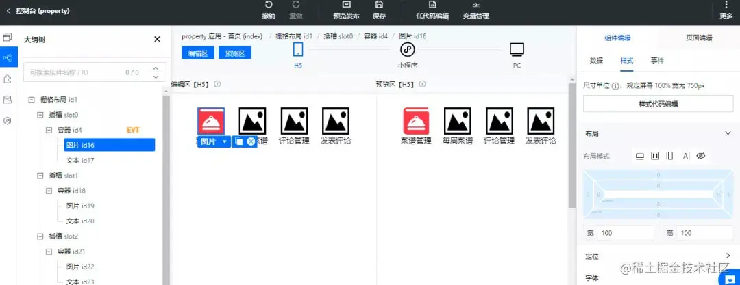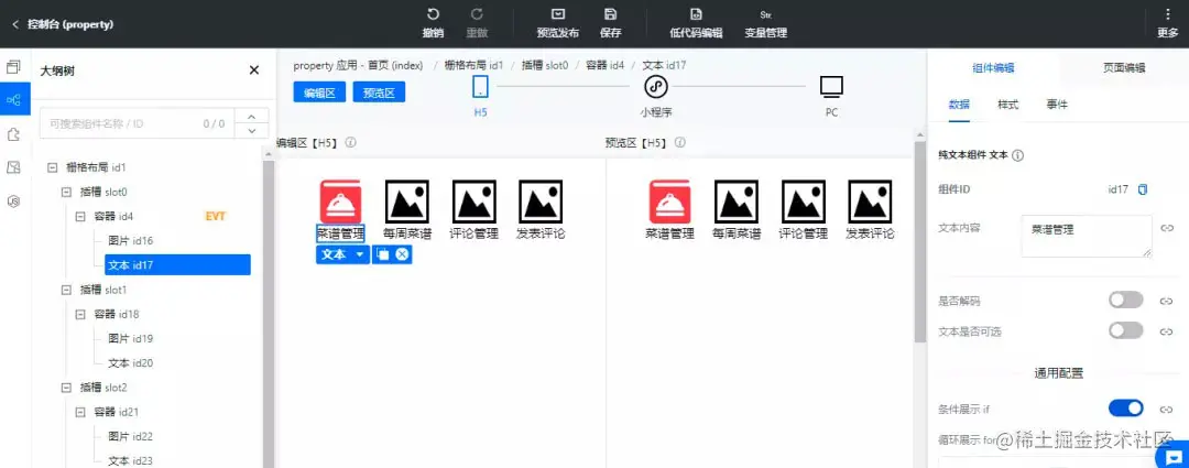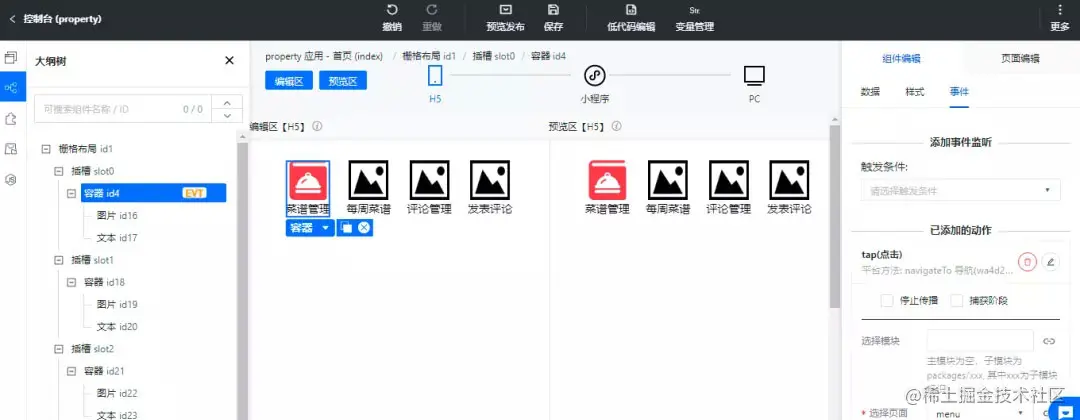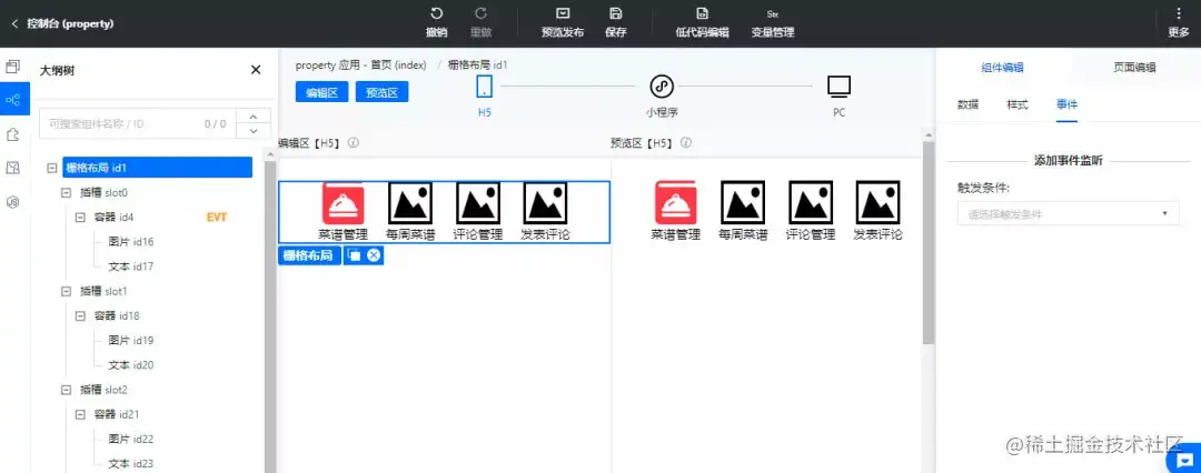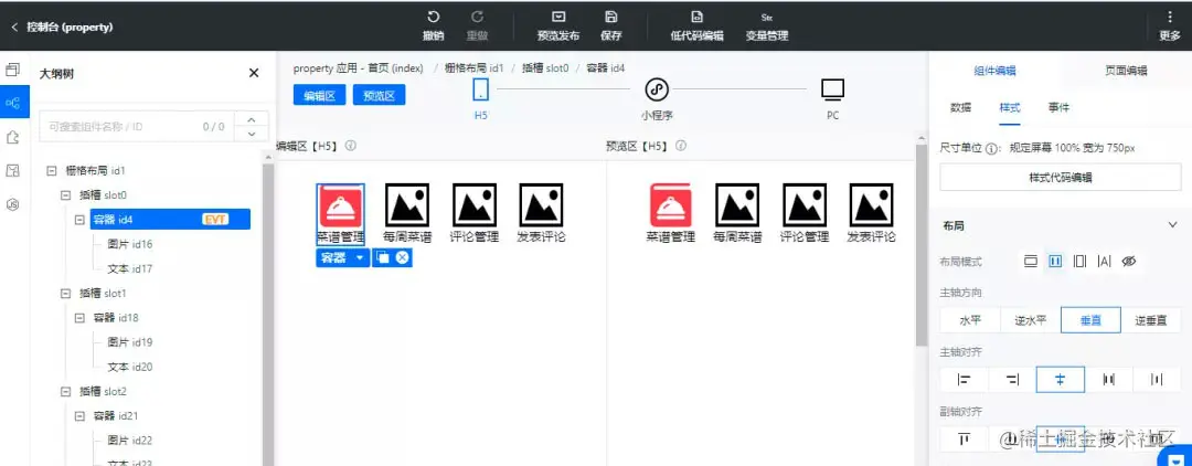 按照相同的方法我们依次在其余的插槽中放置图片和文本组件,修改标题为每周菜谱、评论管理、发布评论