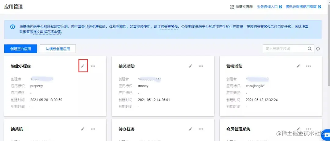 应用创建成功后,我们点击编辑应用按钮就可以进行页面的具体开发了