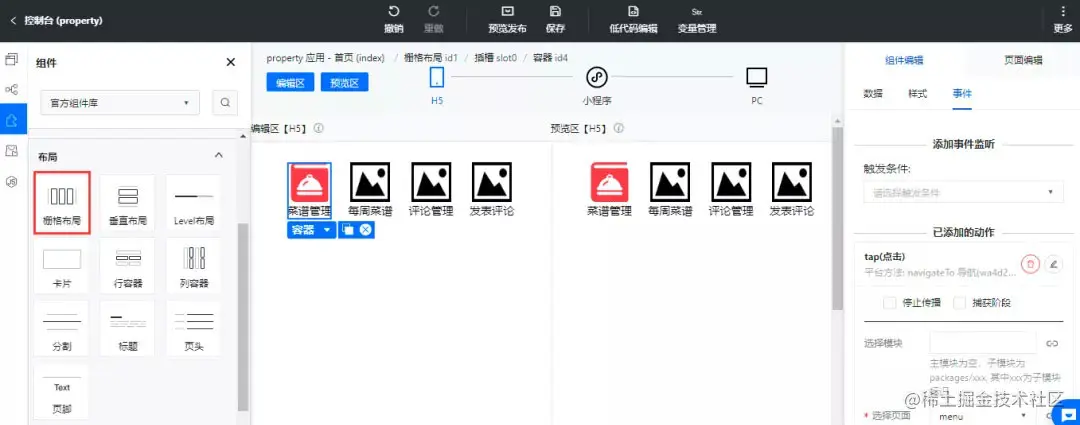 素材有了我们就需要考虑功能的实现了,首页的功能需要选择合适的布局,布局就是规定了页面的结构,因为是图标加文字的形式所以我们选择栅格布局,有四列就足够了。具体的操作方式是选择对应的组件,可以点击也可以拖入编辑区