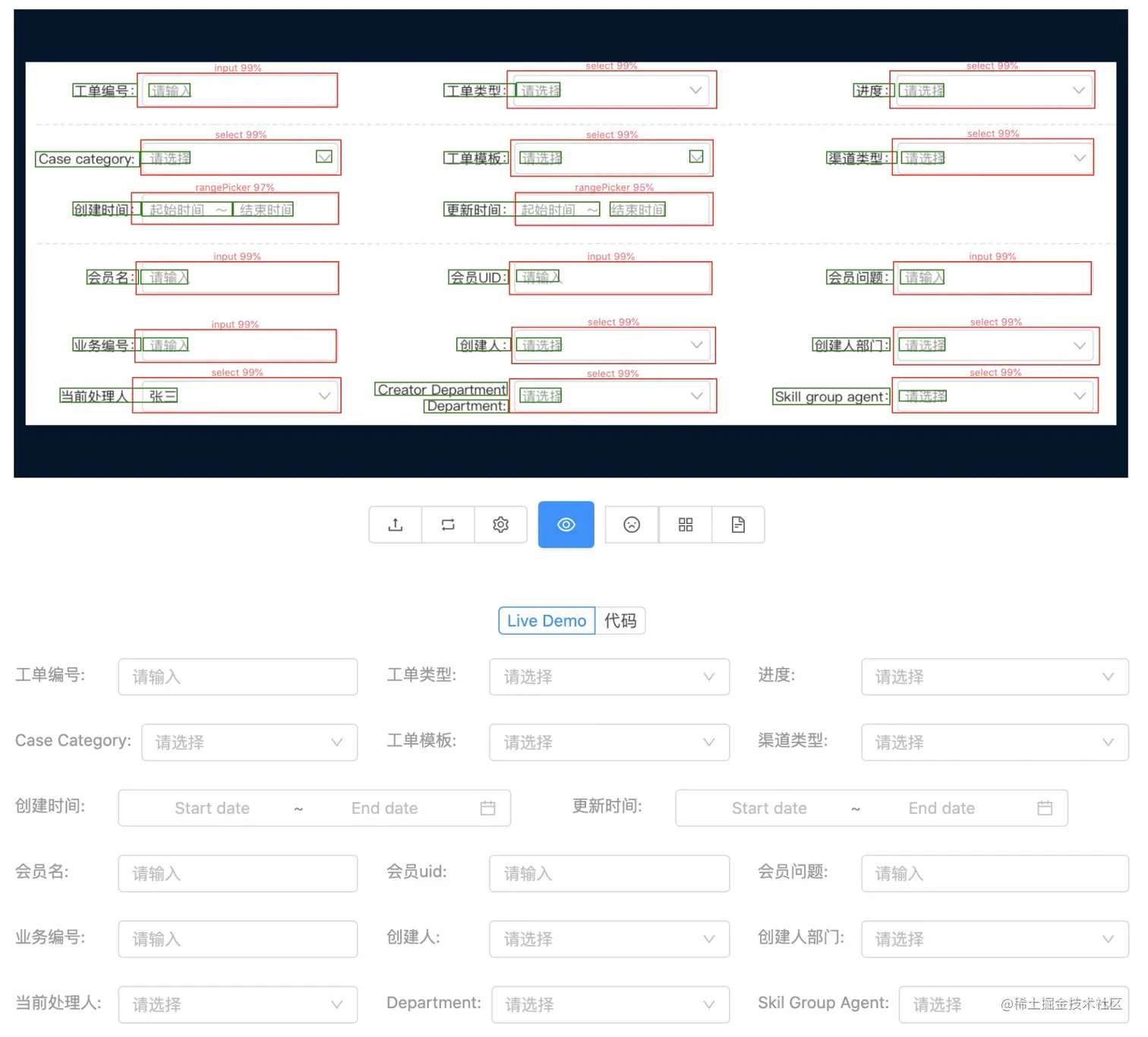 我们可以训练一个目标检测模型,模型输入是表单截图,输出是所有表单项的类型和坐标。这样只需要将设计稿中的表单截图,就可以拿到它里面所有的表单项,配合文字识别出的 Label,就可以生成表单代码了。比如,笔者之前就实现了这样的功能:截图生成表单代码。