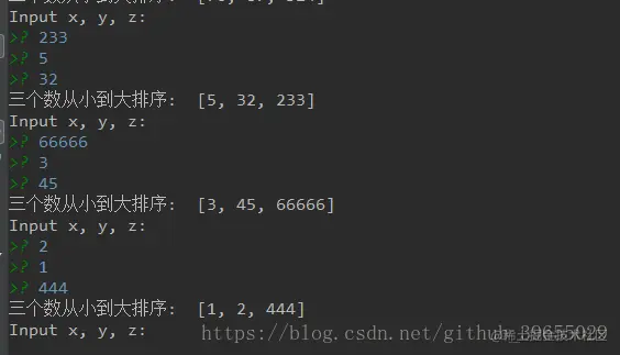 进入死循环,然后分3次输入,每次输入后将其追加到列表中,然后对列表进行排序,最后输出排序好的列表;
