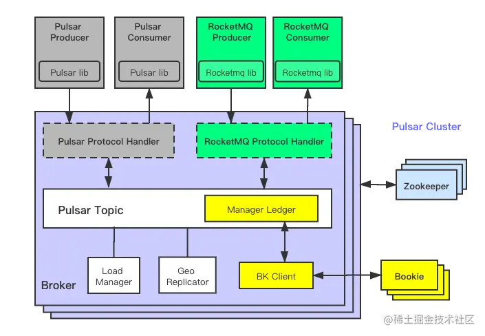 但是,对于使用其他消息传输协议编写的应用程序(例如,RocketMQ),由于使用的消息处理协议和 Pulsar 不同,如果 Pulsar 想要兼容 RocketMQ 协议,为了将 RocketMQ 的协议适配到 Pulsar 的消息协议层中,用户需要重写整个协议层,这给用户的迁移和切换带来了很大的成本。
