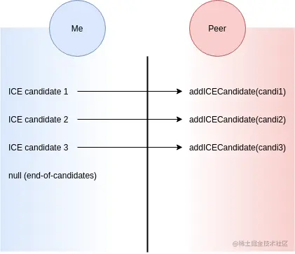 CE候选对象只是应该添加到SDP中的另一个键值对。我们可以等待 WebRTC 找到所有可能的候选并发送完整的 SDP,也可以将每个检测到的 ICE 候选与信令服务器一起发送并逐步扩展 SDP;两个选项都有效。WebRTC 应该知道如何在 ICE 之间交替并选择最可行的选项。