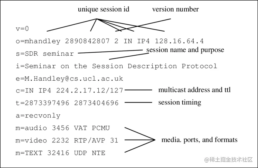 一旦我们知道有人加入了对话,我们就需要交换有关彼此系统的信息以建立连接。此信息基于称为SDP(会话描述协议)的协议,它包括有关其所属对等方的详细信息,例如它使用什么代理、它支持什么硬件、它想要交换什么类型的媒体等。 SDP config 是一个简单的键值对象: