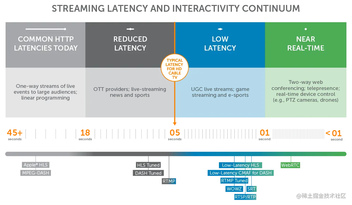 WebRTC不一定要用于视频会议,但绝对是在考虑到这一点而构建的。按照今天的标准,不到一秒的延迟被认为是实时的。WebRTC 是当今最快的解决方案,最重要的是,它是开源的,这使得该技术免费。任何其他解决方案都在延迟方面落后,但请记住,它们的构建目的不是为我们提供实时性能,而是用于不同的目的。下面是一个延迟比较图,这样你就可以了解 WebRTC 到底有多快: