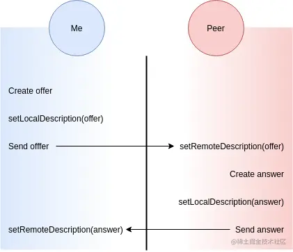 我们要收到一个anwer,提供offer/anwer是双向的但是,重要的是要跟踪有问题的SDP配置代表什么端:我们还是另一端。初始化对等实例时,我们需要两件事:本地描述和远程描述。本地描述,代表我们,远程描述,代表另一端。我们可以一起成功建立连接: