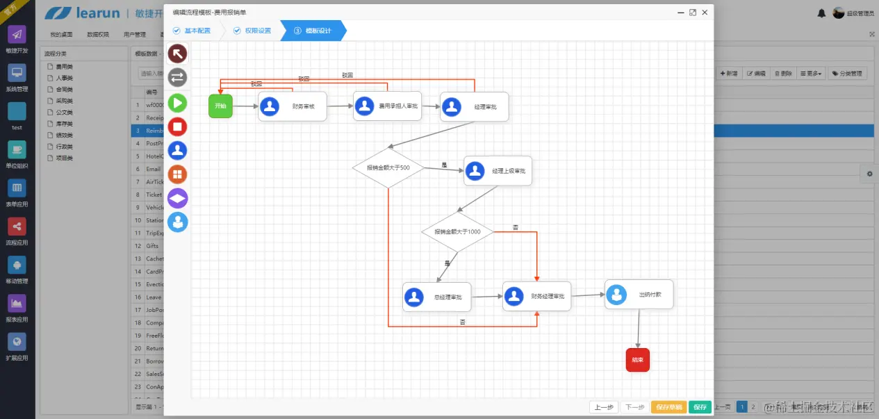 可视化工作流设计器比较直观,用户可以通过拖拉点拽等可视化操作来绘制流程,在流程中的线、节点进行权限和逻辑的配置,在一定程度上消除开发过程中出错的可能性。