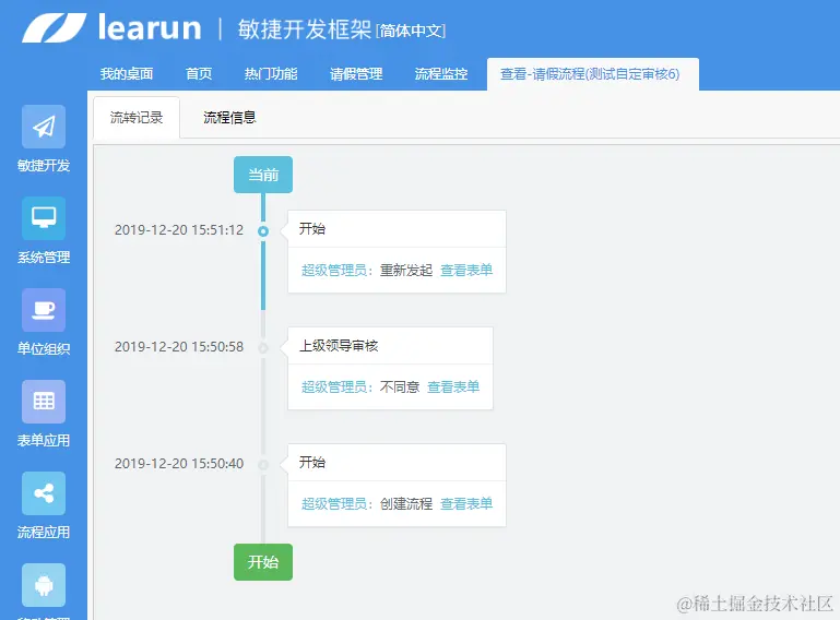 客户界面程序是工作流系统的可视化表现形式,通常使用Web方式进行展现(该页面使用vue),通过提供待办列表、已办列表、执行流程操作、查看流程历史信息等来展现工作流系统的功能。