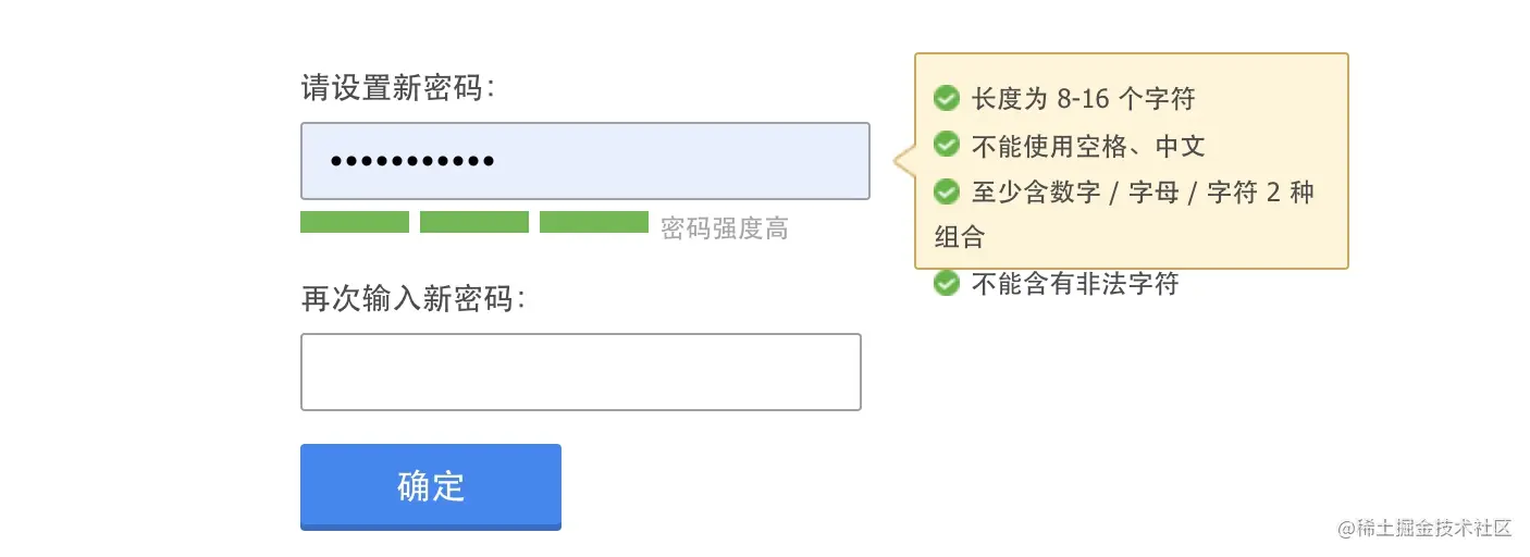 程序规定密码强度规则,用户设置密码时,判断密码的强度是否符合要求,不符合拒绝设置。