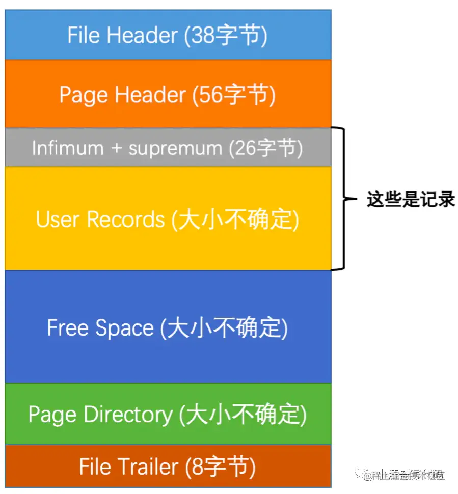 数据页代表的这块16KB大小的存储空间可以被划分为多个部分,不同部分有不同的功能,各个部分如图所示: