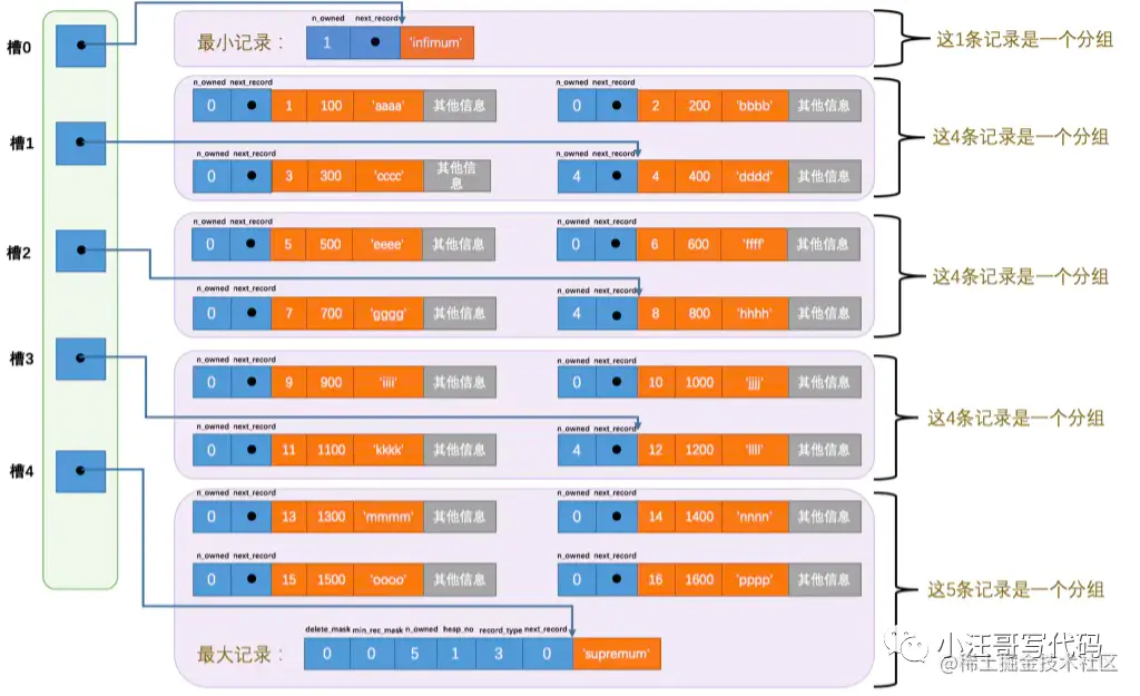 InnoDB会把页中的记录划分为若干个组,每个组的最后一个记录的地址偏移量作为一个槽,存放在Page Directory中。便于二分查找定位数据。
