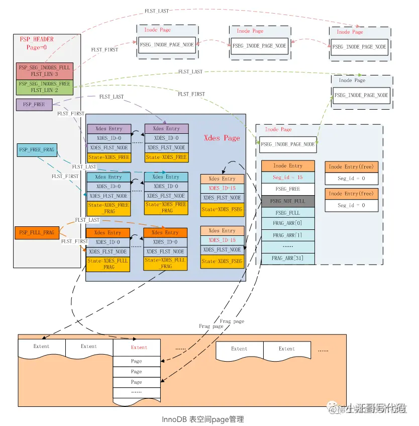 到目前为止,整个数据存储的脉络大概清楚了。InnoDB 页管理的逻辑图如下: