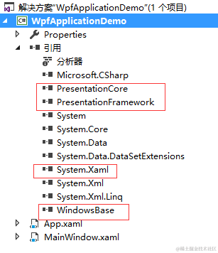 项目默认文件结构,引用中导入了如下4个wpf开发必备的dll,这也是xaml中默认的命名空间。