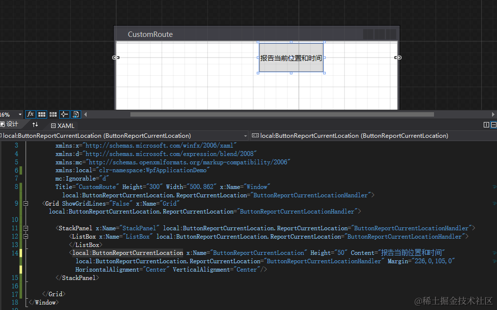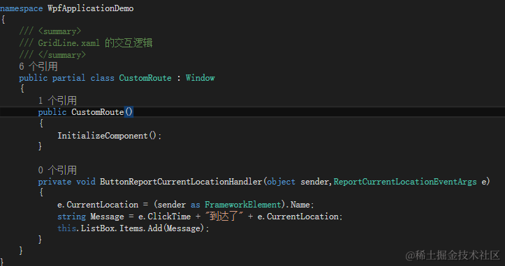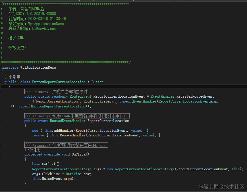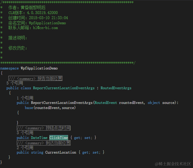 创建继承RoutedEventArgs类的派生类ReportCurrentLocationEventArgs用来携带时间和位置消息,ClickTime属性是用来存储时间,CurrentLocation属性是用来存放位置