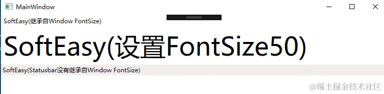 看到上面图片你可能已经发现了问题:StatusBar没有显式设置FontSize值,但它的字体大小没有继承Window.FontSize的值,而是保持了系统的默认值。导致这样的问题是因为并不是所有元素都支持属性值继承的,如StatusBar、Tooptip和Menu控件。另外,StatusBar等控件截获了从父元素继承来的属性,并且该属性也不会影响StatusBar控件的子元素。例如,如果我们在StatusBar中添加一个Button。那么这个Button的FontSize属性也不会发生改变,其值为默认值。