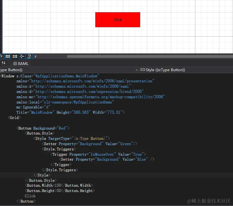 本地属性集在设置时具有最高优先级,动画值和强制除外。 如果在本地设置某个值,你可以期待该值优先得到应用,甚至期待其优先级高于任何样式或控件模板。 在上面示例中,此处Background本地设置为红色。 因此,即使它是隐式样式,否则将会应用于该作用域中的该类型的所有元素,在此作用域中定义的样式不是最高优先级给予Background属性及其值。 如果从该 Button 实例中删除本地值红色,样式将获得优先级,而按钮将从该样式中获得 Background 值。 在该样式中,触发器具有优先级,因此当鼠标位于按钮上时,按钮为蓝色,其他情况下则为绿色。