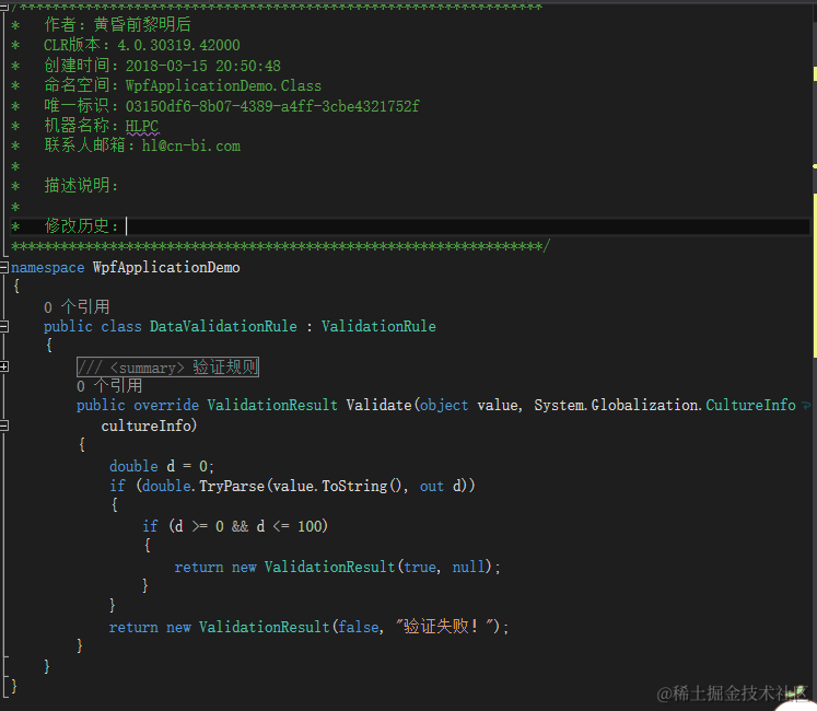 Binding的数据校验工作是派生自ValidationRule类,并且对Validate方法进行重写的自定义类!看一下实例: