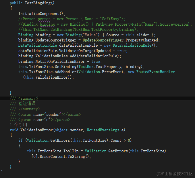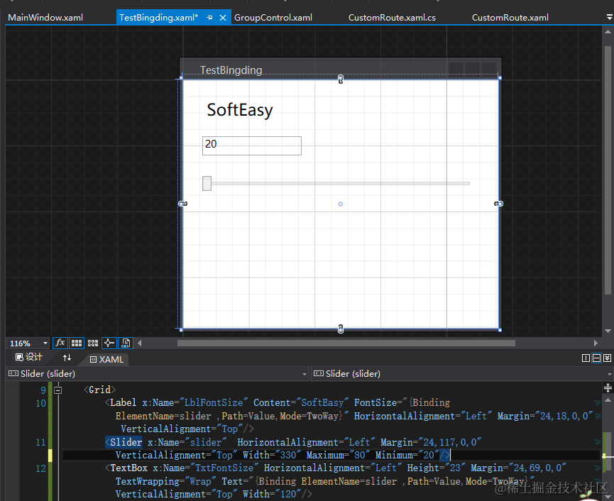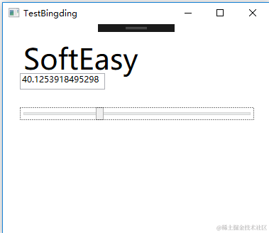 这里有3个控件,Slider,TextBox,Label,其中TextBox和Label都作为目标,Slider都作为数据源,把Slider中的值交由两个控件体现,移动滑块,TextBox会自动显示Value的值,也就是FontSize的值。因为两个绑定都设置了双向绑定,所以可以在文本框中输入值,然后丢失焦点,也能反馈回去。