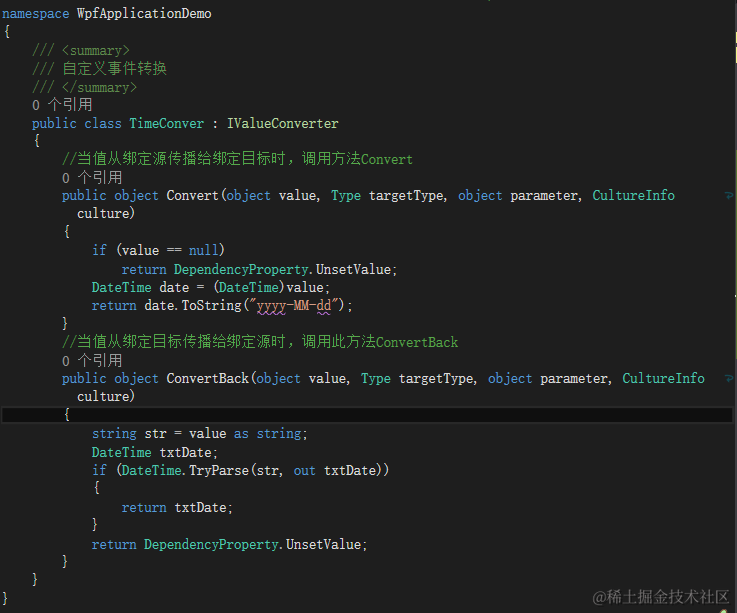 2.当值从绑定目标传播给绑定源时,调用此方法ConvertBack,方法ConvertBack的实现必须是方法Convert的反向实现。