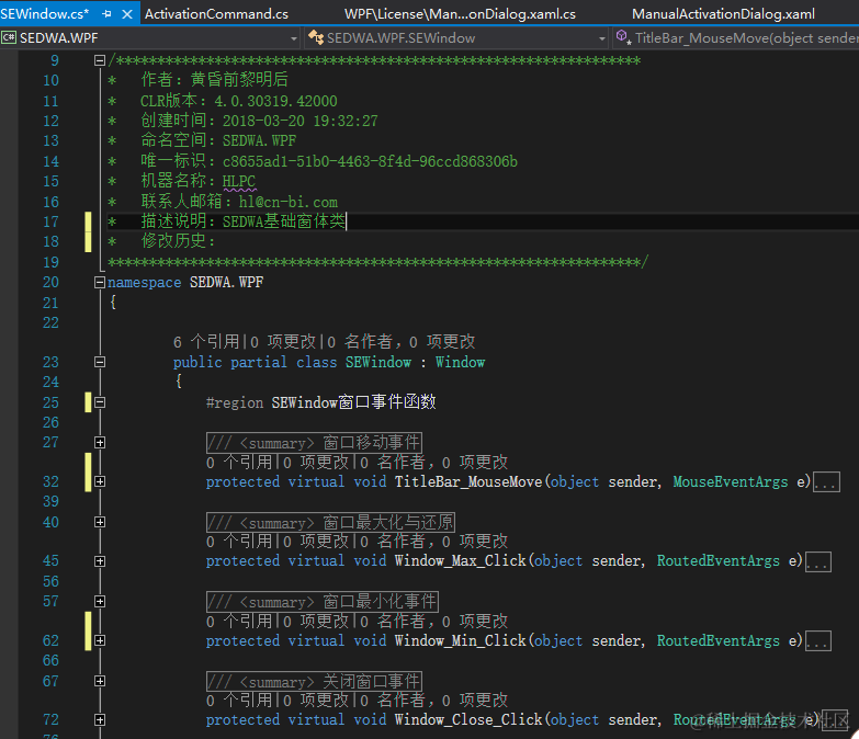 添加一个名为 SEWindow 的类,Window 类引入System.Windows 命名空间,关闭事件,双击事件,最大化与还原事件可能存在重载版本的时间及方法需要用 virtual 关键字标识。