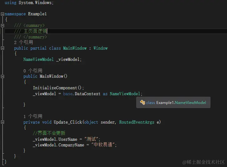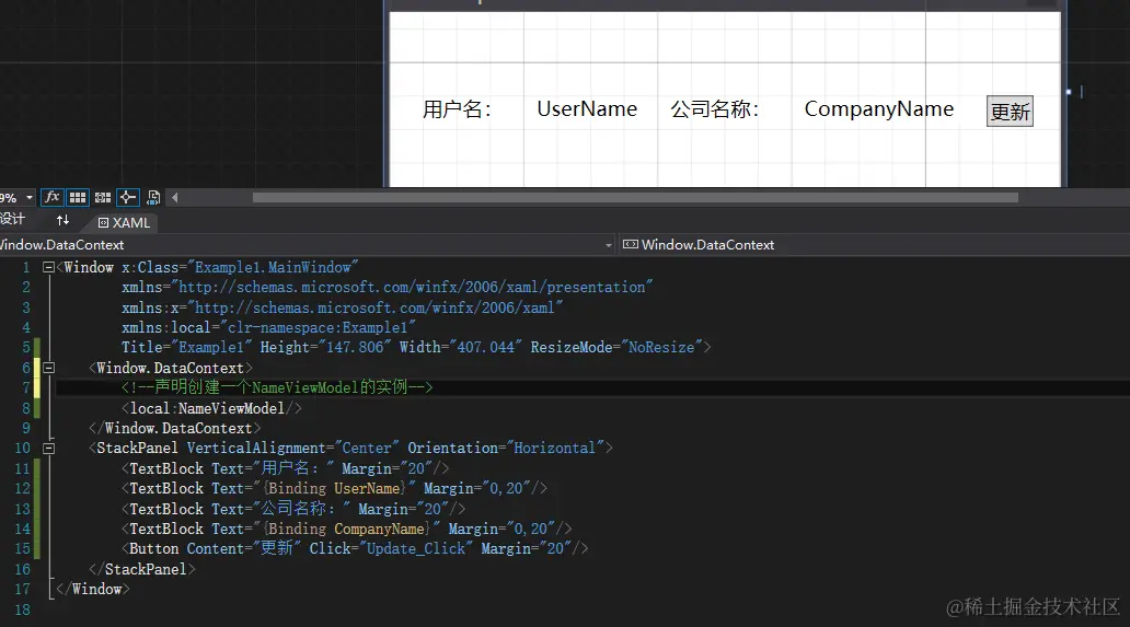 这里会产生多个事件。首先,我们检查了我们是否真的改变了属性。第二,如果值已经改变,我们向所有监听者注册PropertyChanged事件。现在我们有了一个模型Name和一个视图模型NameViewModel。我们只需要在定义视图。只需要修改视图MainWindow: