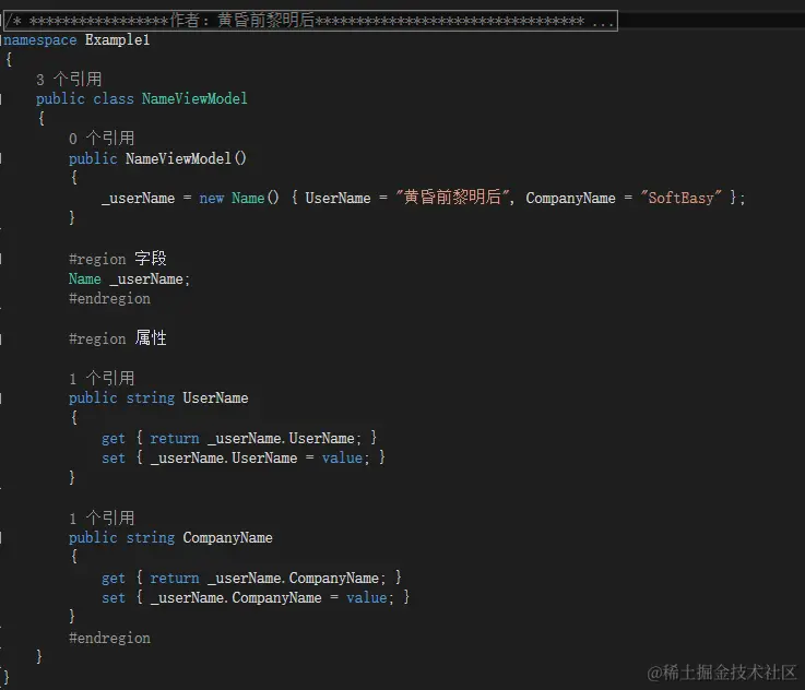 请注意这个视图模型不是十分正确的。因为我们在视图模型里暴露了属性,我们显然会想使在代码里改变的用户名和公司名自动的显示在视图上