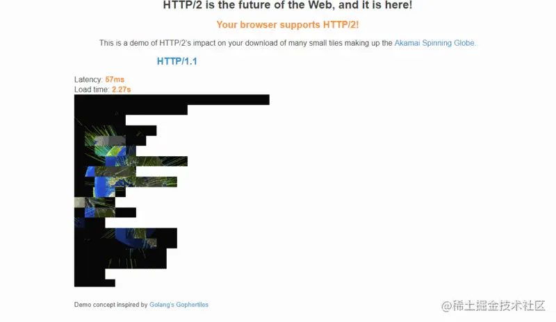 可以通过该链接直观感受下 HTTP/2 比 HTTP/1 到底快了多少: http2.akamai.com/demo