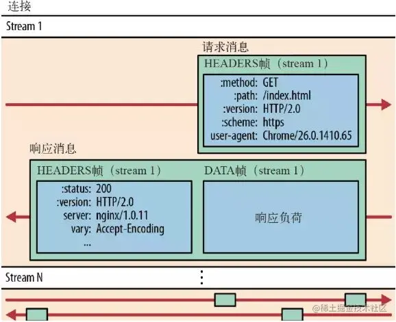 HTTP/2 中,同域名下所有通信都在单个连接上完成,该连接可以承载任意数量的双向数据流。每个数据流都以消息的形式发送,而消息又由一个或多个帧组成。多个帧之间可以乱序发送,根据帧首部的流标识可以重新组装