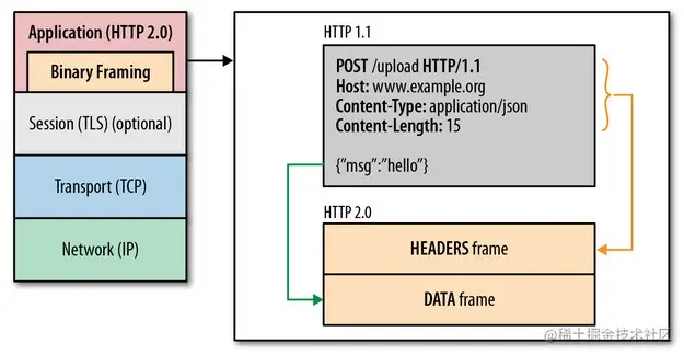 关键之一就是在应用层(HTTP/2)和传输层(TCP or UDP)之间增加一个二进制分帧层。