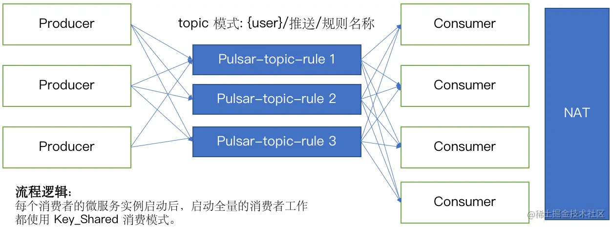 最初设计时,我们想在客户端类型和服务端类型都使用 Key_Shared 消费模式。下图为客户端类型(以 HTTP 为例)的设计,客户每配置一条数据流转规则,我们就在 Pulsar 中创建一个 topic,consumer 消费 topic,再经过 NAT 网关推送到客户的 HTTP 服务器。