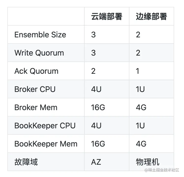 我们采用容器化部署方式为两类用户部署:使用 deployment 方式部署 broker,StatefulSet 方式部署 BookKeeper 和 ZooKeeper。部署场景包括云端部署和边缘部署,不同的部署方式对可靠性、性能要求不同,我们设置的部署参数如下: