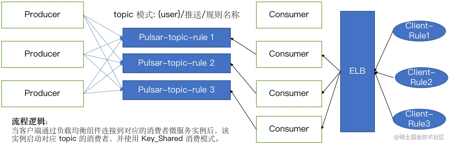 - Pulsar 可扩展至百万级 topic。我们可以将一个规则对应于一个 Pulsar topic。AMQP 客户端上线时,即可从上一次消费到的位置开始读取,保证不丢消息。
