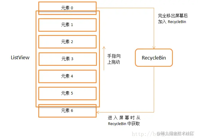 这里在第 19 行会调用 RecyleBin 的 getScrapView() 方法来尝试从废弃缓存中获取一个 View,那么废弃缓存有没有 View 呢?当然有,因为刚才在 trackMotionScroll() 方法中我们就已经看到了,一旦有任何子 View 被移出了屏幕,就会将它加入到废弃缓存中,而从 obtainView() 方法中的逻辑来看,一旦有新的数据需要显示到屏幕上,就会尝试从废弃缓存中获取 View。所以它们之间就形成了一个生产者和消费者的模式,那么 ListView 神奇的地方也就在这里体现出来了,不管你有任意多条数据需要显示,ListView 中的子 View 其实来来回回就那么几个,移出屏幕的子 View 会很快被移入屏幕的数据重新利用起来,因而不管我们加载多少数据都不会出现 OOM 的情况,甚至内存都不会有所增加。