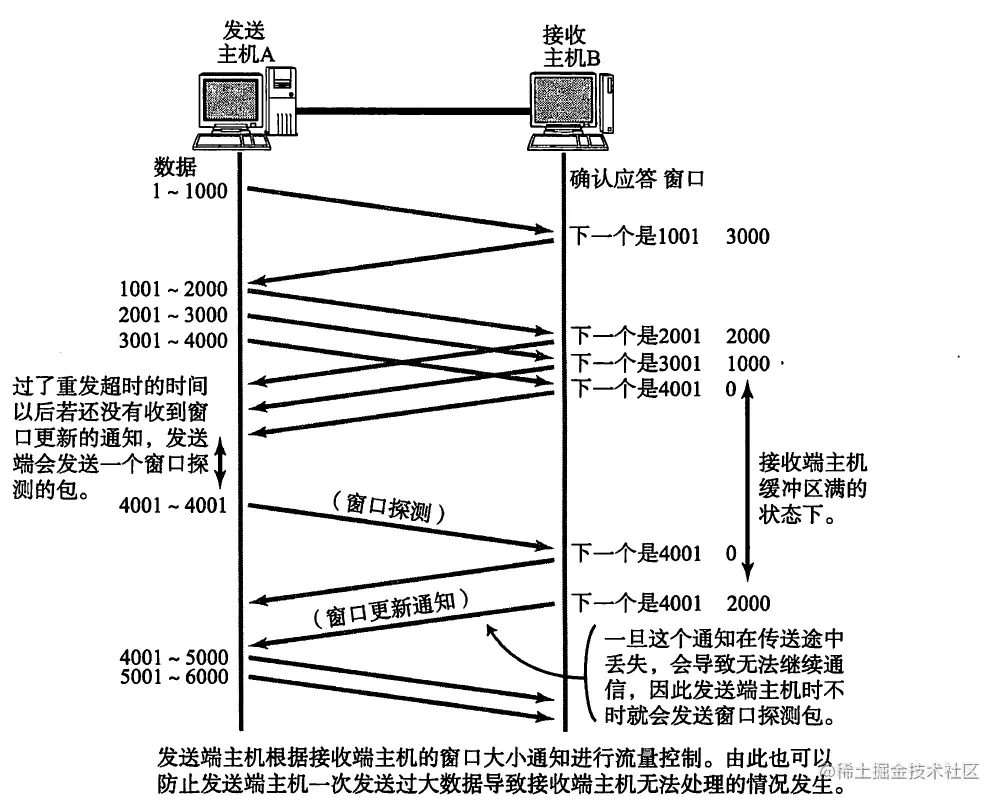 从图中可以看到,如果过了重发时间还没有收到窗口的更新通知,会发送一个探测报文去探测接收方的窗口。