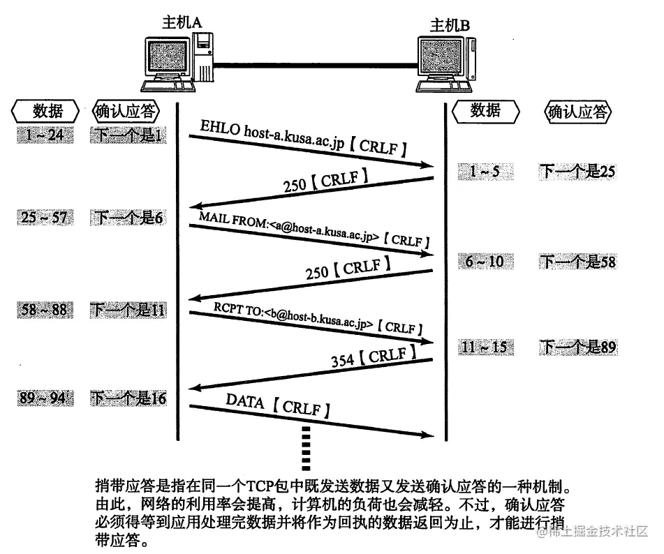 再说说捎带应答,TCP 的确认应答和回执数据可以通过一个包发送。
