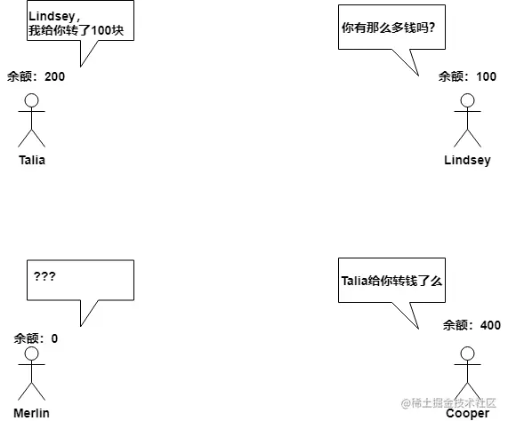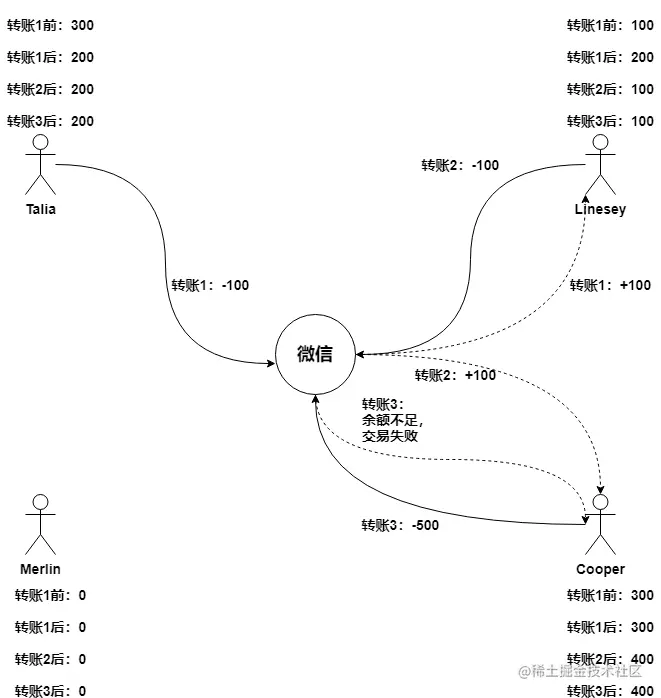 考虑一个转账的场景, Talia (300) 给 Lindsey(0) 微信转账 100元,Lindsey(100) 给 Cooper(300) 转账100元,Cooper 给 Merlin (0)转账 500 元, 交易正确性是如何确保的。