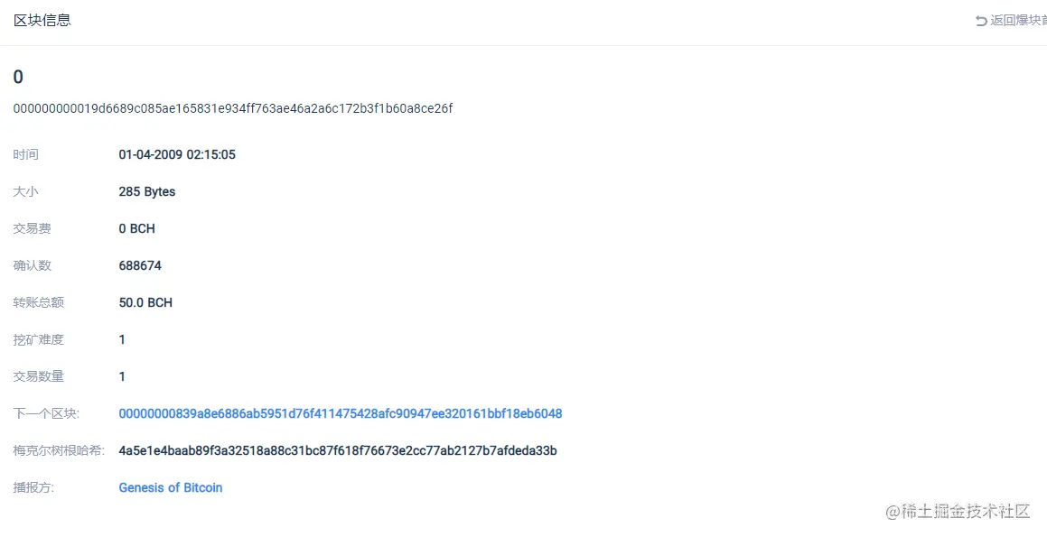 为了防止账本被篡改,每个区块中都会记录上一个区块的哈希值,也被称为哈希指针,这样一个不断向前的指针,最终会指向第一个创世区块,把所有的区块紧紧联系在一起。可以理解为一个每个区块存放上一区块地址的单向链表,上图, 下一个区块地址是比特币浏览器方便用户查看,处理后的数据。