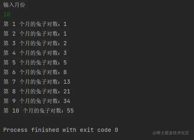 古典问题:有一对兔子,从出生后第 3 个月起每个月都生一对兔子,小兔子长到第三个月后每个月又生一对兔子,假如兔子都不死,问每个月的兔子对数为多少?(输出第 10 个月的兔子对数)