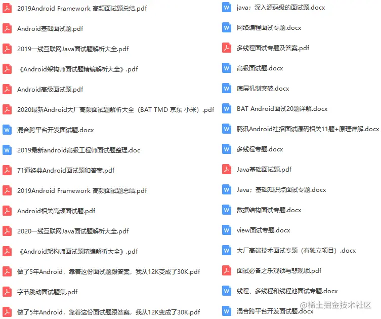下面是有几位Android行业大佬对应上方技术点整理的一些进阶资料。希望能够帮助到大家提升技术。如果大家想要获取的话,可以评论【666】免费获取哦~