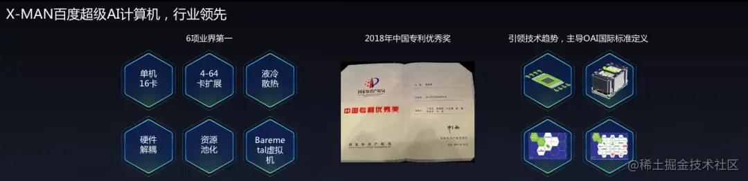在大会现场,侯震宇向嘉宾介绍了百度超级AI计算平台 X-MAN。目前,X-MAN 已经升级到第四代,是业界首款支持 OAI 标准和液冷散热的超级 AI 计算平台,可解决 CPU+GPU 配比计算、通信带宽瓶颈、高性能存储三大问题。百度 X-MAN 超级 AI 计算平台提供极致的计算性能,支持超大复杂算法模型,能够快速及时处理海量数据。自诞生以来,百度 X-MAN 超级 AI 计算平台历经3代发展,3次架构升级,创造6项业界第一,同时期关键技术&性能保持领先,引领行业发展趋势。目前,X-MAN 系列产品已在百度大规模应用,正在助力百度 AI 战略快速落地。