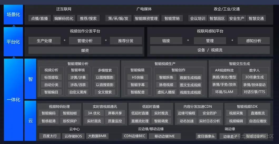AI-Native 的 AI 应用开发平台具备“云智一体“的核心技术,助力企业实现云能力与 AI 能力的深度融合,最大化的发挥出云计算性能,实现与视频、区块链、硬件等生态的链接,让客户享受到端到端的应用开发全流程体验。在会上,侯震宇带来了百度智能云最近发布的智能视频云全景图。百度智能视频云融合了百度前沿的视频云技术和 AI 能力架构矩阵,从云智技术一体化、产品平台化、应用场景化三个层面全面赋能视频创作、生产、应用等全流程,在广电媒体领域、工业领域、交通领域等场景有着广泛应用。