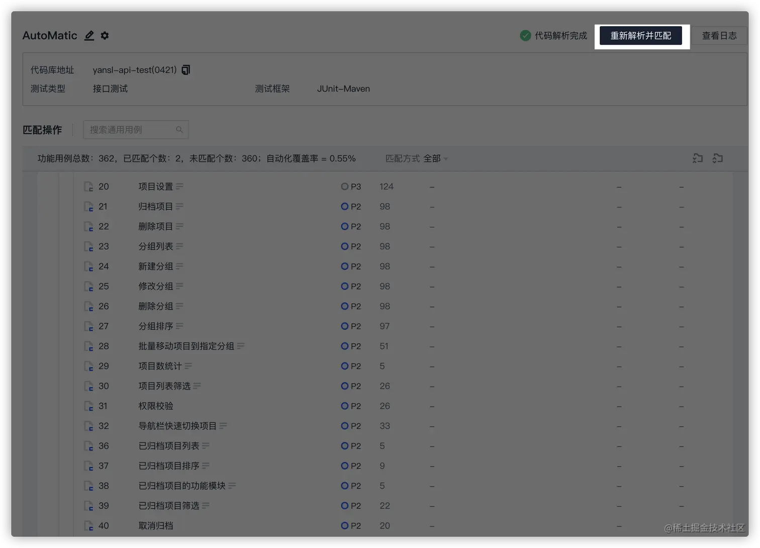 - 解析自动化代码库的测试函数列表,并建立用例管理中的功能用例与自动化函数的匹配关系,得出自动化覆盖率。通过匹配自动化代码和功能用例,可以帮助我们对自动化代码产生的价值建立直观感受,做到“心里有数”。