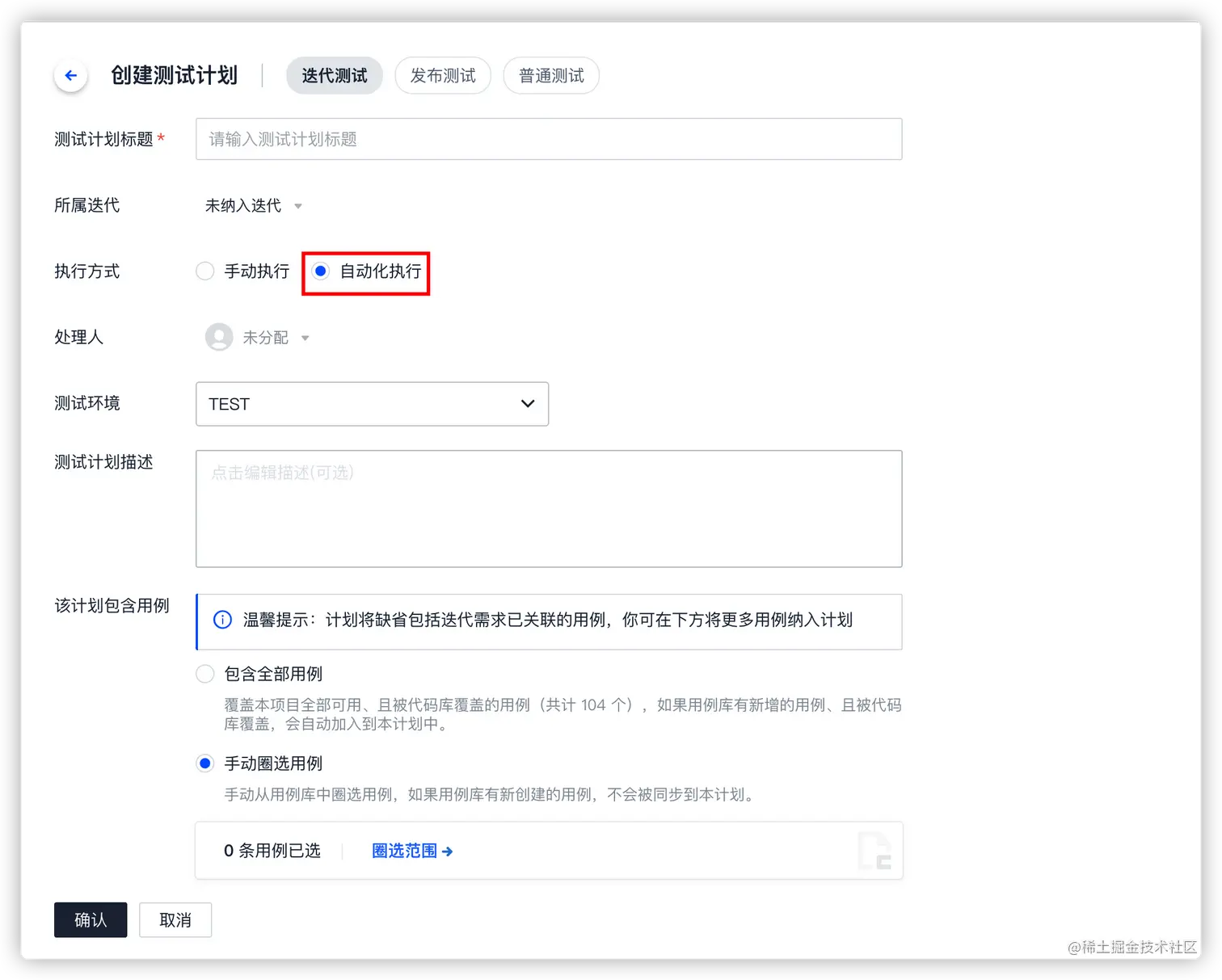 创建执行方式为自动化执行的测试计划,圈选用例。