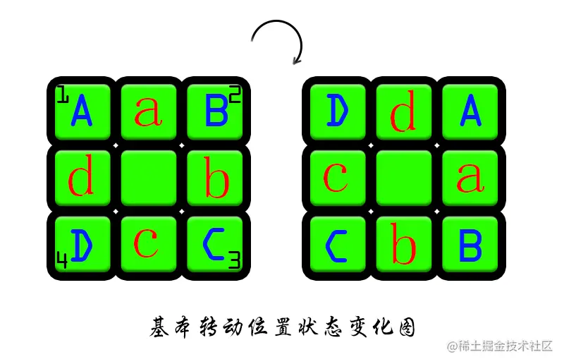 上图中讲述两个排列怎么发生的置换操作,应该很清楚明了了,这在数学中记为,表示这个置换可以分解成 3 次对换,所以是一个奇置换。也可以这么看,只经过一次对换操作是奇置换,上述置换由 3 个奇置换复合,所以合起来也为奇置换。有了这基本认识之后,我们来看看因为魔方基本转动所带来的一些性质或者说约束。